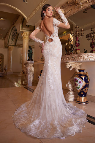Isabel wedding gown. This gown features a sheer strapless bodice and A-line skirt cut from layers of soft tulle to a floor-sweeping hem. The bodice has supportive internal boning to ensure it stays in place and is framed by elongated tulle sleeves split along the inseam,